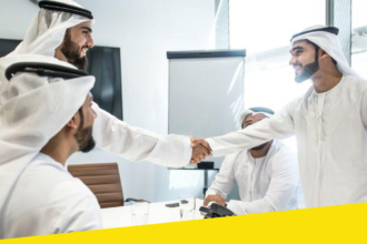 The image depicts Emirati professionals in a formal business setting, symbolizing cooperation,…