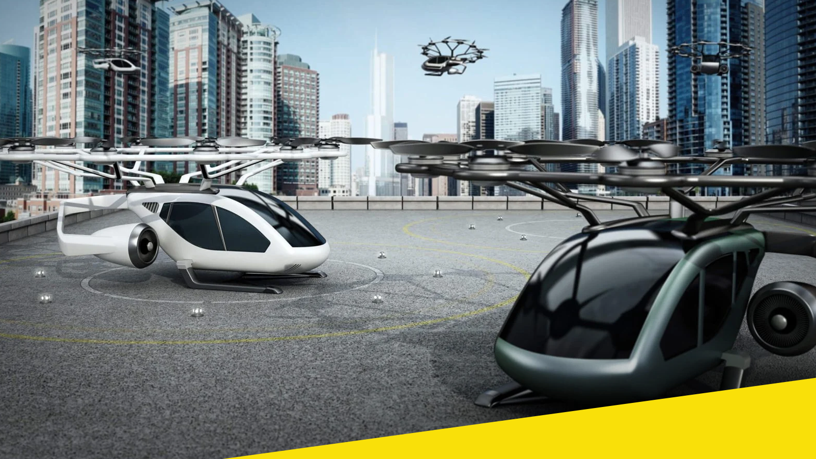 The United Arab Emirates is rapidly strengthening its position as a global hub for smart mobility innovation, with advanced aerial transport concepts moving closer to real-world deployment. The image illustrates next-generation electric vertical take-off and landing (eVTOL) aircraft positioned on a rooftop landing pad amid a modern city skyline, symbolizing the country’s vision for future urban transportation.